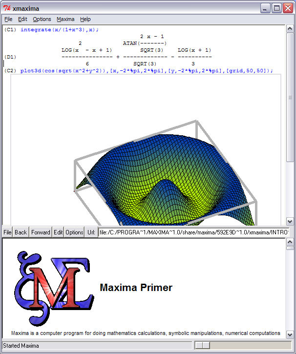 MaximaMaxima es un sistema para la manipulación de expresiones simbólicas y numéricas, incluyendo diferenciación, integración, desarrollos en series de Taylor, transformadas de Laplace, ecuaciones diferenciales ordinarias, resolución de sistemas de ecuaciones lineales, matrices, tensores... Maxima puede también realizar gráficas utilizando funciones matemáticas, o tablas de datos, en dos y tres dimensiones.