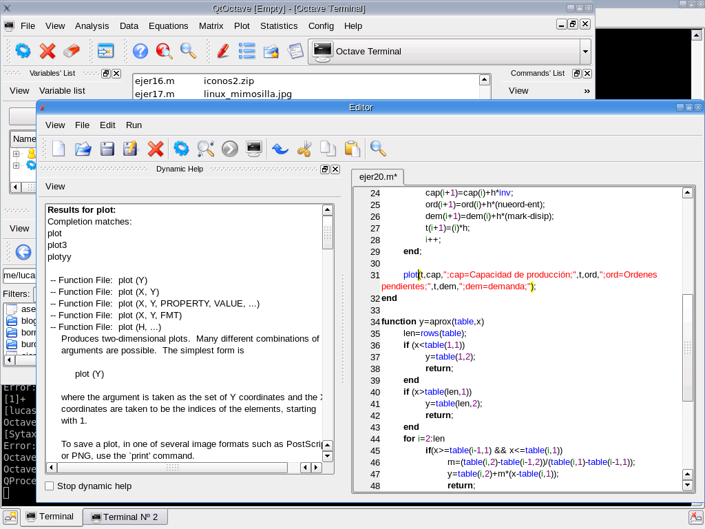 GNU OctaveGNU Octave es un lenguaje de alto nivel inicialmente desarrollado para operaciones numéricas. Proporciona una interfaz de línea de comandos para resolver problemas numéricos tanto lineales como no lineales.
