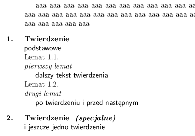 | odległość po nagłówku | określa odległość w poziomie, między tekstem nagłówka, a treścią twierdzenia; znak spacji oznacza normalną przerwę między wyrazami (zmienną w razie potrzeby), wstawienie polecenie \newline powoduje że tekst wnętrza jest składany ,,od nowej linii'' |